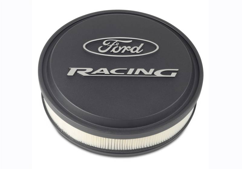Ford Racing Slant Edge Air Cleaner-Black Dress up your engine compartment with this drop base style Ford Racing air cleaner. 3 3/4 in. clearance required from carburetor air cleaner mounting flange to hood. Slowly close hood on initial installation to insure proper clearance. 13 in. Diameter 3 in. Motorcraft FA612R Filter Included Attractive Black Crinkle Finish Fits Common 4 Barrel 5 1/8 in. Carburetor Flange Clearance Required 3 3/4 in. From Carburetor Air Cleaner Mounting Flange To Hood
