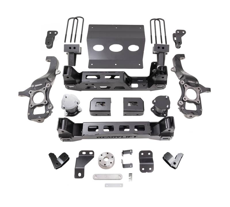 ReadyLIFT '' all-new Ford 6 '' Lift Kits have become a crowd favorite for the new 2021-2023 F-150 trucks. With high demand, we are excited to announce our new 44-21630 kit which is designed for trucks equipped with dampening adjustable CCD shocks. CCD stands for Continuously Controlled Damping and is a fully automated computer-controlled system that works alongside the Terrain Management System (TMS) for precise control and handling on changing road surfaces. This new 6" Lift Kit delivers a first-class ride and handling with plenty of tire clearance combined with a great-looking lifted stance in our all-new family of high-performance big lift kits for Ford F-150 models. This new ReadyLIFT 6" Lift Kit is developed to give F-150 owners a complete big lift option that lifts the front of the vehicle 6" giving the F-150 a lifted but neutral stance. This CCD-compatible kit retains factory electronic shocks via precision-engineered shock extensions. The new ReadyLIFT Ford F-150 6 '' kits are equipped with heavy-duty 1/4" steel plate construction front and rear crossmembers that offer unmatched strength for all driving conditions. Featuring a set of durable lifted knuckles and strut spacers, you gain enough ride height to run up to 35-inch tires with the right wheel, or a 37 '' tire with some trimming! The new 6 '' systems include everything necessary to correct suspension, steering, and driveline geometry to maintain on-road handling while improving strength and offroad capability. Fabricated steel 4" tall rear block offers the correct amount of rear lift while the factory-style U-bolts aid in ease of installation.