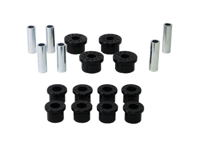 With over 40 years of history, Nolathane remains the number 1 replacement and enhancement bushing and chassis component brand throughout Australia & New Zealand and now boasts a warehouse in California & catalog to suit the North American market.\nAll in one leaf spring bushing service kit covering front and rear eyes of the leaf plus shackle bushings. High kilometres and heavy load carrying causes excessive wear on rubber bushings. Nolathane's signature black bushings are made tough and offer outstanding abrasion resistance, high load bearing capability (4WD's, utes and towing), flexibility, increased tensile strength and chemical resistance to oil, grease, ozone and weathering.