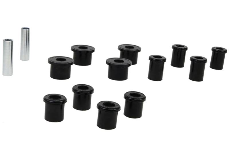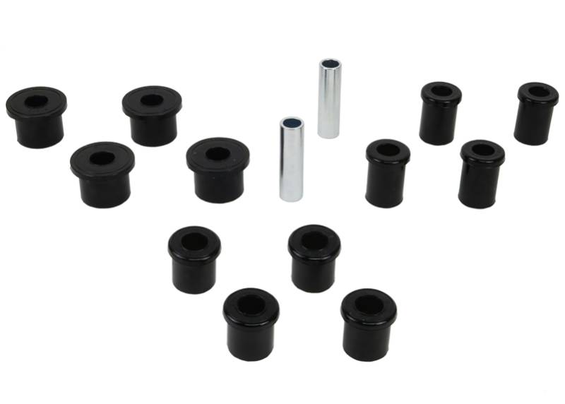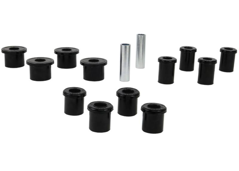 With over 40 years of history, Nolathane remains the number 1 replacement and enhancement bushing and chassis component brand throughout Australia & New Zealand and now boasts a warehouse in California & catalog to suit the North American market.\nAll in one leaf spring bushing service kit covering front and rear eyes of the leaf plus shackle bushings. High kilometres and heavy load carrying causes excessive wear on rubber bushings. Nolathane bushings are made tough and offer outstanding abrasion resistance, high load bearing capability (4WD's, utes and towing), flexibility, increased tensile strength and chemical resistance to oil, grease, ozone and weathering.