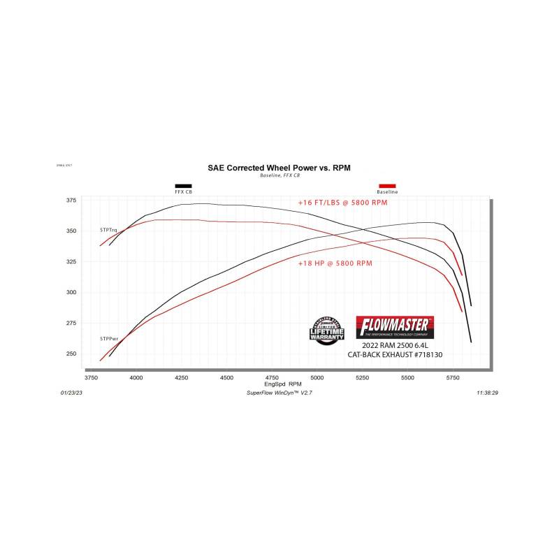 This Flowmaster® Flow FX® cat-back exhaust system for the 2014-2024 RAM 2500 trucks with the 6.4-liter HEMI engine is manufactured using durable 409 stainless steel throughout and features 3.50 to 3.00-inch mandrel bent pipes for better exhaust gas flow. Maximum increases on the dyno revealed 18 hp and 16 lb-ft of torque at the rear wheels over stock. This system exits with dual 4.00-inch black stainless steel tips for added style and a custom look. The system uses all the existing factory hanger locations and includes installation instructions and all necessary hardware for an easy installation that you can do at home. Backed by Flowmaster's Lifetime Limited Warranty.
