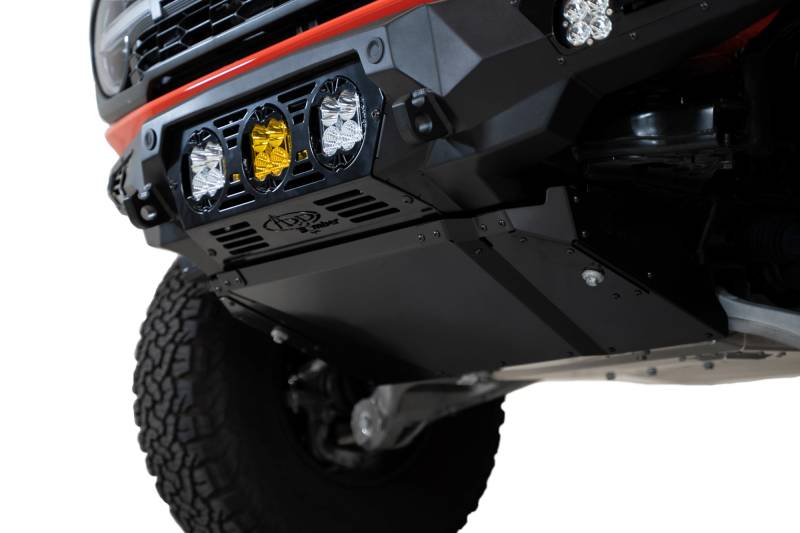 Bomber Front Bumper The Bomber is a tight fitting front bumper for the Bronco Raptor. At the center of the bumper, is a satin black aluminum panel that frames 3 mounting points for Baja Designs LP4 lights. At the sides of the bumper are mounting points for cube lights. The Bomber is constructed from modern plate steel, finished in a hammer black powder coat. The aluminum panels are finished in a satin black powder coat.