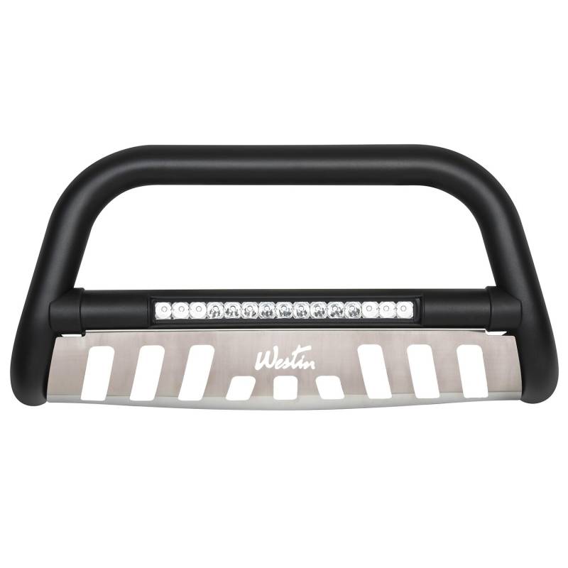 Ultimate LED Bull Bar Westins Ultimate LED Bull Bar will take your truck to the next level with this cool new look! The integrated light bar is a 20 single row with 15 x 3 Watt Osram LEDs. The LED light bar is flush mounted in the center cross tube and weather sealed for moisture resistance. Built with 3 steel tubes, our Ultimate LED Bull Bar features molded transition bushings and a brushed stainless steel skid plate for a perfect look. The product is available in chrome plated stainless steel backed by a lifetime warranty, and in textured black powder coat backed by a 3-year warranty. Make a bold statement with Westins new Ultimate LED Bull Bar and give your truck the durability, look and style it deserves. Mount kit included Made of 3" tube Molded bushings for a finished look Includes 20" combo beam LED light bar Wiring harness included