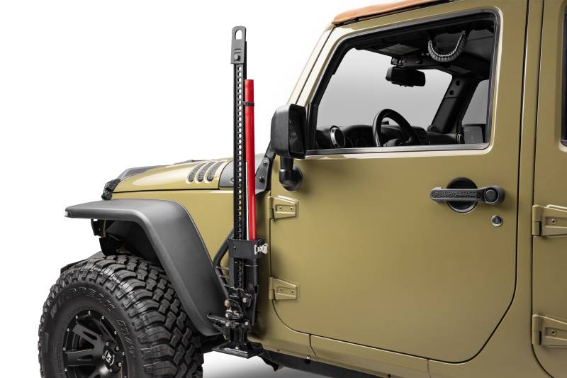 Front driver side exterior jack mount for the Jeep Wrangler JK and JKU - Easily mounts high clearance off-road and farm jacks securely to side of your Jeep. The unique design keeps the jack from rattling while driving. Easy bolt-on, no-drill installation. The Jack Mount comes with a Limited Lifetime warranty on materials and construction and a 5 year warranty on the the textured black finish.