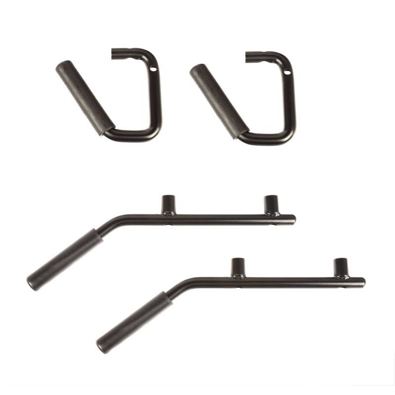 Metal Grab Handles, Steel, F/R Set, 07-18 Wrangler JK Rugged Ridge Steel Grab Handles for 07-18 Wrangler JK give lifted Jeep owners a helping hand when climbing in and out of their rigs. Constructed from high-strength tubular steel, each handle is positioned at the forward corner of the door opening-right where it?s needed most. Off-Roaders will also love the stability these handles offer when the trail becomes less-than-tame. With soft padded hand grips and a matte powder coat finish, these grab handles make an attractive addition to any JK interior. Available in pairs for front passengers, rear passengers, or as a complete kit for both 2 and 4-door models. Installation hardware is included.