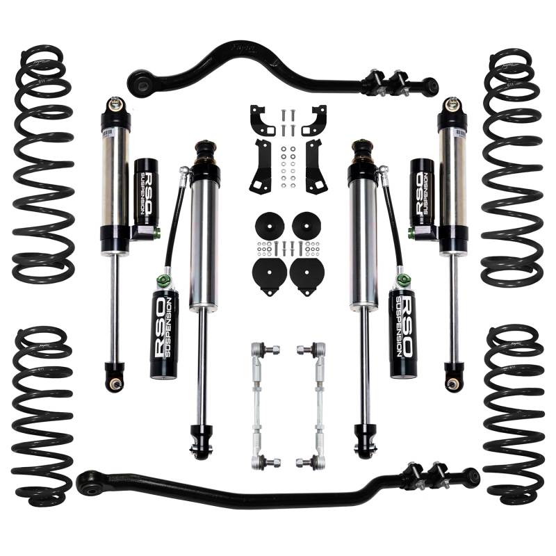 RSO Suspension 2.5 inch Stage 3.1 Lift Kit - 07-18 Jeep Wrangler JK/JKU RSO Suspension’s 2.5 inch Lift Kits for the Wrangler JK/JKU are the ultimate solution for your next adventure. Designed to enhance articulation, stability and performance on and off road while giving you a driving experience like no other. High quality materials and coatings ensure lifelong durability from everyday city driving to steep inclines on the toughest trails. Engineered to replace the weak factory components that limit wheel travel, ground clearance and articulation. Installing a lift lets you add larger tires increasing the ability to go over larger obstacles without damage to the underside of your Wrangler. Each kit's components were specifically chosen to work together to give your ride the best balance of performance and comfort. Multiple kit stages let you choose the level of performance and value you want to experience on your Wrangler and offer the ability to upgrade further down the line. Elevate your off-road experience with our RSO suspension lift kits, the ultimate solution for those seeking adventure and off-road enthusiasts alike. Designed to enhance articulation, stability and performance on and off road. High quality materials and coatings for long life and corrosion free performance on any terrain Replaces weak factory components that limit your wheel travel, articulation and break over angle Installing a lift kit allows the installation of larger tires for better ground clearance to go over taller obstacles without damage to the underside of your Wrangler Specifically chosen and combined parts that complement each other to give your vehicle the best balance of performance and comfort Multiple kit stages let you choose the level of performance you want to experience for the best value