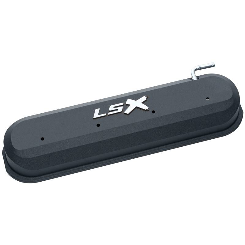 Raised "LSX" Emblem Aluminum Valve Covers, Black Crinkle, LS Engines Through innovative engineering, PROFORM has developed a valve cover that will take your generic looking stock LS engine, and give it a totally personalized look. These new valve covers are taller than stock valve covers, and can accommodate a wide variety of large valve train applications. These valve covers are available in multiple styles, which include raised and recessed emblems. Unique mounting studs, and oil restricting baffles are included. Threaded mounting holes for the optional Integrated Ignition Coil Bracket included. The passenger side valve cover has an oil filler hole. Sold in pairs. U.S. Pat. D657,798.