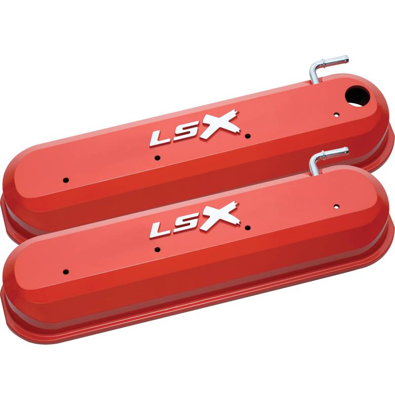 Raised "LSX" Emblem Aluminum Valve Covers, Chevy Orange, LS Engines Through innovative engineering, PROFORM has developed a valve cover that will take your generic looking stock LS engine, and give it a totally personalized look. These new valve covers are taller than stock valve covers, and can accommodate a wide variety of large valve train applications. These valve covers are available in multiple styles, which include raised and recessed emblems. Unique mounting studs, and oil restricting baffles are included. Threaded mounting holes for the optional Integrated Ignition Coil Bracket included. The passenger side valve cover has an oil filler hole. Sold in pairs. U.S. Pat. D657,798.