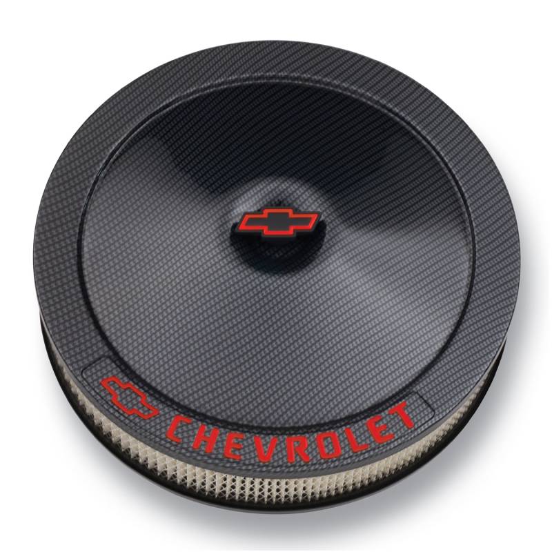 Engine Air Cleaner Kit Charcoal colored carbon fiber is one of the most popular materials used in manufacturing today because of its strength and attractive looks. Proform's new Carbon-style engine dress-up products are stamped steel parts with a carbon fiber film adhered to the exterior surface giving the parts that look customers crave at a reasonable price with the strength of steel. This product includes a black Bowtie center nut, and all the necessary mounting hardware.