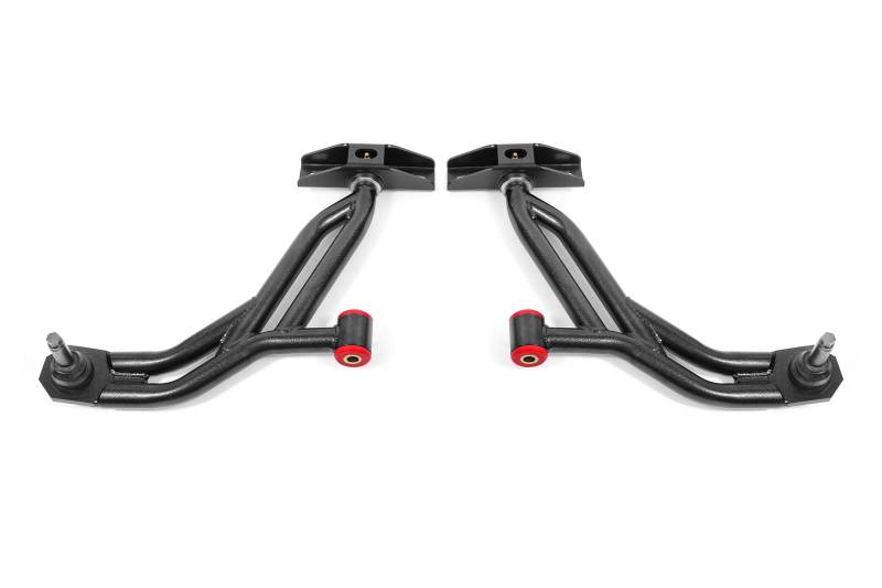 A-arms, Lower, Non-adjustable, Poly/Delrin Bushings, 19mm Tall Ball Joint A-arms are one of the most important, yet overlooked suspension components. They are the direct link between the front wheels and the chassis. Any deflection causes a change in alignment, which results in poor performance and driving feel. Fabricated from heavy-duty 1.25-inch, 0.095-inch wall DOM tubing, deflection is eliminated with A-arms from BMR's suspension. BMRs AA755 Lower A-arms are equipped with greasable heavy-duty ball joints, 95-durometer polyurethane bushings (front mount), and greasable Delrin bushings (rear mount) to handle the high loads. Polyurethane bushings add a solid, more responsive feel over the stock rubber bushings. BMRs bushings are internally fluted, which allows grease to evenly coat the inner sleeve. These flutes also direct grease to the outer edge of the bushing, keeping the thrust surface lubricated. This efficient lubrication ensures quiet, reliable operation over the life of the bushings. The combination of poly and Delrin bushings gives you improved steering feel and responsiveness for any for of driving. Based on our well proven traditional A-arm design, these Handling A-arms feature taller ball joints to raise the roll center height on lowered vehicles for improved handling.BMRs AA756 lower A-arms eliminate A-arm deflection, greatly improving steering feel and response in normal and performance driving situations.