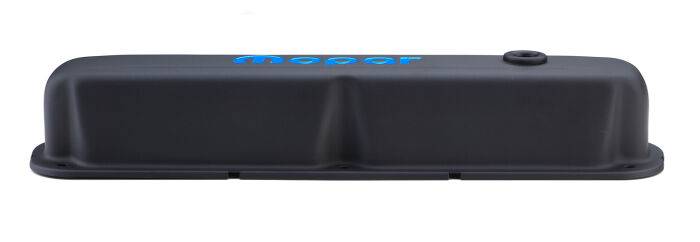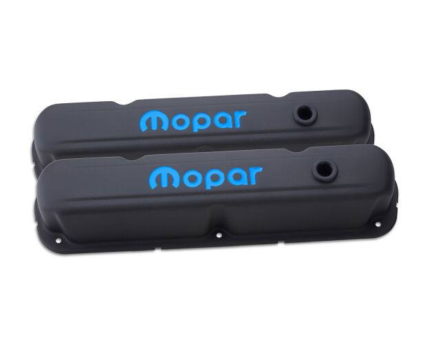 Engine Valve Covers Here's a look that's new, and eye catching! The vintage MOPAR emblem has been stamped into these valve covers, then hand painted with a shade of blue matches engine blocks from the era. Oil restricting baffles are pre-installed. All valve covers are sold in pairs, and come equipped with air breather and PCV grommets, unless specified otherwise.