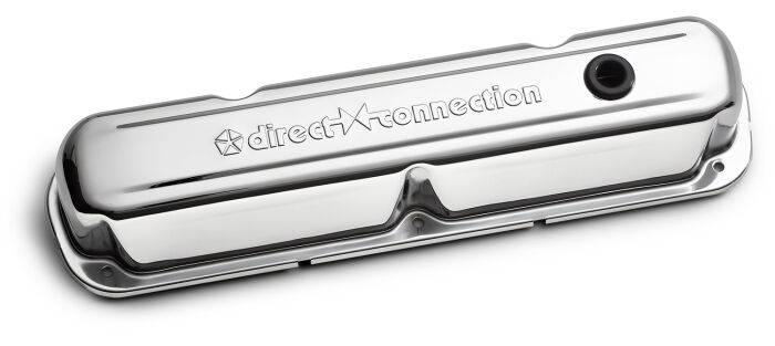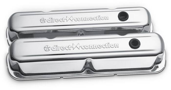 Engine Valve Covers The vintage Direct-><-Connection emblem has been stamped into these valve covers for a nice raised 3D look. Beautiful chrome finish that coordinates nicely with other chrome engine dress-up parts. Oil restricting baffles are pre-installed. All valve covers are sold in pairs, and come equipped with air breather and PCV grommets, unless specified otherwise.