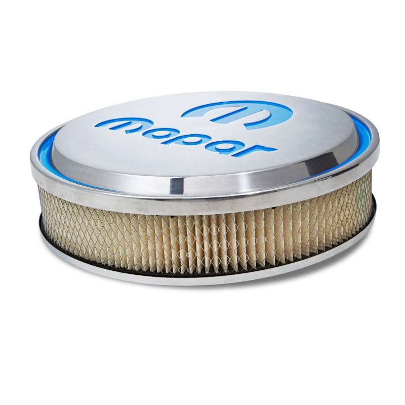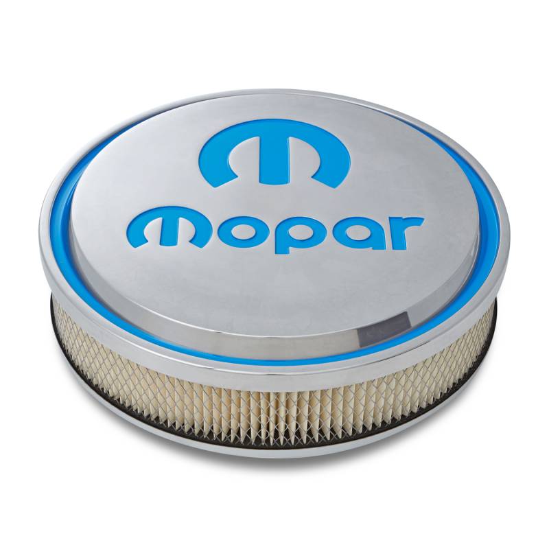 14" Air Cleaner Kit'slant-Edge Air Cleaners are the perfect way to complete your dress-up look in premium Slant-Edge style. If you've got polished or chrome valve covers, these will set your engine bay OFF like no other air cleaner. The over-sized MOPAR emblem with MOPAR blue inlaid paint is next level. They are supplied with genuine 3" GM air filter elements (GM P/N 6421746, AC Delco P/N A212CW) for maximum airflow. Each kit is supplied with necessary mounting hardware. Technical Note: After installing a new air cleaner, always lower the hood slowly to confirm sufficient clearance visually. Minimum clearance of 3-3/4" is required from the top of the carburetor gasket area to the underside of the hood. The air cleaner base is recessed for a low profile appearance. Patented Design.