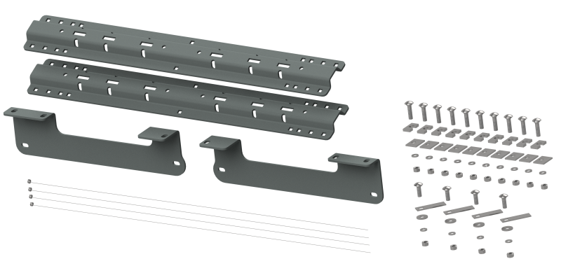 Custom Installation Kit For Universal Mounting Rails For Some Ford Trucks Custom installation brackets provide a No Drill alternative to install mounting rails in the bed of your truck. Custom installation brackets mount beneath your truck bed to provide attachment points for 5th Wheel hitch rails Bolt on application Sturdy steel construction Powder Coat Finish 2 Base rails, custom brackets, and hardware included
