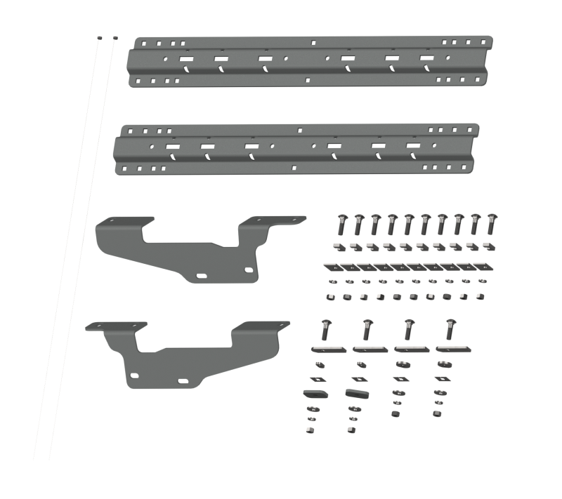 Custom Installation Kit For Universal Mounting Rails For Some Ford Trucks Custom installation brackets provide a No Drill alternative to install mounting rails in the bed of your truck. Custom installation brackets mount beneath your truck bed to provide attachment points for 5th Wheel hitch rails Bolt on application Sturdy steel construction Powder Coat Finish 2 Base rails, custom brackets, and hardware included
