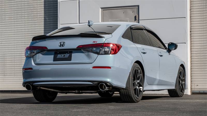 Cat-Back Exhaust System - S-Type This Borla(r) Cat-Back(tm) system for the Acura Integra and Civic Si is designed specifically for these vehicles. The 2.5" diameter system features Borla(r)'s Polyphonic Harmonizer Technology which utilizes patented units that contain pipes of different diameters and lengths to create multiple exhaust notes that harmonize to deliver a clean, rich, full-bodied sound to the Borla(r) mufflers. The muffler then enhance this sound to the character and volume appropriate for the aggressive ATAK(r) sound level that this system delivers. Borla(r) is so confident of our engineering and technology in this system that we offer a no drone guarantee. System features single 4.5" bright chrome on T-304 stainless steel tips on each tail pipe. Systems with black chrome on T-304 stainless steel tips, and carbon fiber tips are also available. Borla(r) Cat-Back(tm) & Axle-Back exhaust systems feature patented straight-through and multi-core technology to unleash hidden horsepower. Increased exhaust velocity adds power, driving excitement, fuel economy, and the distinctive Borla(r) Sound of Power respected by motoring enthusiasts everywhere. Each system is built from premium T-304 austenitic stainless steel, superior to T-400 series knockoffs (such as 409), to give you the absolute best in performance and durability. Ultra-smooth mandrel bends ensure maximum flow & power, and precision computer numerical control (CNC) manufacturing ensures an accurate fit. Best of all, Borla(r) stands behind every system with a Million-Mile Warranty. Just what you'd expect from the world's most experienced (and most winning) exhaust brand. System features Polyphonic Harmonizer technology