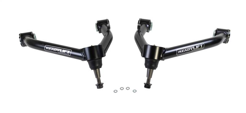 ReadyLIFT is excited to release SST Upper Control Arms(UCA), sold in pairs, as part of our ever-expanding suspension accessories. SST UCA '' are designed for and compatible with most lifted trucks. ReadyLIFT UCA kits are the same arms included in our full SST Lift Kits; however, they are now available standalone for customers seeking to upgrade their lifted truck with superior UCAs. Upper Control Arms are a great addition to lifted trucks. They provide improved suspension geometry for improved tire wear, increased stability, better handling, and exceptional road feel. Upper Control Arms are an integral part of independent front suspension (IFS) vehicles and generally connect the top of the knuckle to the frame. The UCA continually locates and guides the knuckle in a pre-determined path when the suspension cycles up and down during driving. Drivers can have confidence knowing the vehicle has superior stability and motion control over rough terrain - whether from rugged trails or ragged city streets. This improved stability on highways helps inspire confidence while navigating curves and turns without worry. ReadyLIFT SST UCA kits are constructed from Drawn Over Mandrel (DOM) round steel tubing. DOM tubing is produced for a more exact OD and ID tolerance and has the highest weld strength possible making ReadyLIFT UCAs some of the toughest tubular arms in the industry. On the knuckle end the DOM arms are then equipped with HD ball joints for superior strength and long life. Where the arms meet the frame, ReadyLIFT uses proprietary Terrain Control Technology bushings to ensure quiet, durable, and stable pivot performance. Finally, ReadyLIFT arms are powder-coated for an attractive yet durable finish.
