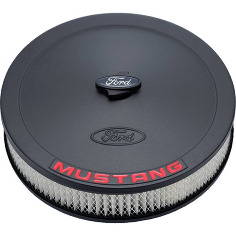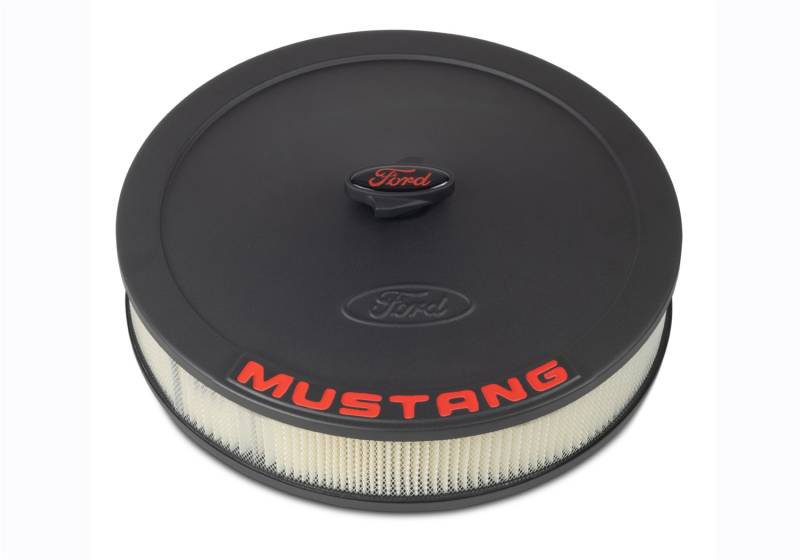 Air Cleaner Kit: Black Crinkle Finish, Red Mustang Emblem Add a Ford RACING, MUSTANG or COBRA Air Cleaner to your engine for that customized look. These 13 in. diameter air cleaners fit both 2 barrel and 4 barrel carburetors and include a high-performance filter element. Ford logo air cleaner center nut is also included. Air Cleaner Kit