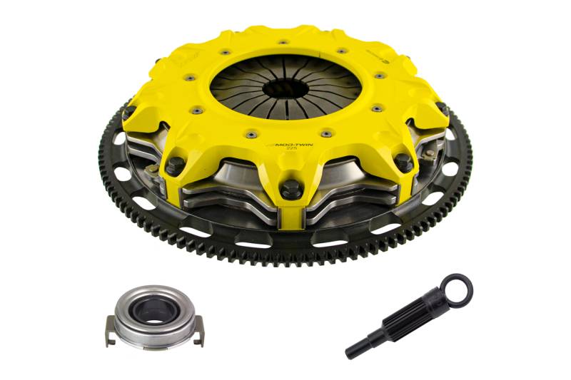 ACT Mod-Twin 225 Heavy Duty Sprung Street Clutch Kit T1SS-S01 Mod-Twin 225 HD Sprung Street Kit is designed for high powered AWD street cars. It unites uncompromised pedal feel, durability, engagement quality with very high torque capacity by combining twice the organic friction surfaces with an ultra-durable spring center Mono-Drive hub in a completely modular design. Each diaphragm spring endures an exclusive four-stage heat treating process providing a consistent light pedal feel. Steel-backed Friction Plates with high quality organic friction materials deliver stable friction coefficient, good heat capacity and long clutch life. These Friction Plates uniformly transfer torque to the Mono-Drive sprung hub assembly which extends input shaft life and reduces driveline shock from torsional vibration. This kit includes a CNC-machined and dynamically balanced flywheel, pressure plate cover, diaphragm spring, face, puck-style ceramic friction plates, sprung Mono-Drive hub assembly, floater, patented Monoloc Collar, release bearing, alignment tool and pilot bearing (if needed). Mod-Twin clutches are fully rebuildable and most components can be ordered separately. "Excellence in Performance", backed by the best one-year warranty in the industry!