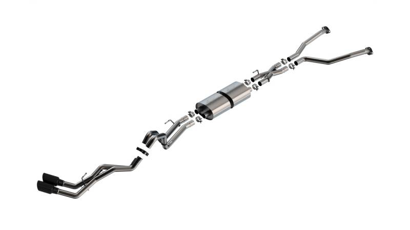 Cat-Back Exhaust System - ATAK® Includes Hybrid models. Will NOT fit with optional bed step. This 2.5" diameter Cat-Back system features a True Dual design with two full tail pipes (Not just a single tail pipe with dual tips) that is unique in the industry. It was designed specifically for the Tundra 3.4L. The system features the aggressive Borla ATAK muffler and Polyphonic Harmonizer Technology inside the muffler assembly which utilizes patented units that contain pipes of different diameters and lengths to create multiple exhaust notes that harmonize to deliver a clean, rich, full-bodied sound without any drone. The system also features a Merge X-Pipe for increased performance and improved sound. The system is finished off with single 4.5" round black chrome on T-304 stainless steel tips on each tail pipe. Using Borla Stainless Steel Polish p# 21461 is NOT recommended with these black chrome tips. We suggest cleaning the tips with hot water and a microfiber cloth. Systems with bright chrome on T-304 stainless steel tips, and carbon fiber with black anodized center tips are also available. Add Extension Pipes 60734 for Crew Cab with Standard Bed (6' 6") 157.7" Wheelbase vehicles. Add Extension Pipes 60735 for Extended Cab with Long Bed (6' 1") 164.6" Wheelbase Vehicles. It is built with premium, high-quality austenitic T-304 stainless steel for a sharp appearance and long life. Our computer numerical control (CNC) manufacturing techniques ensures accurate fit and maximum performance. Mandrel bends ensure maximum flow & power. Best of all, Borla stands behind every system with a Million-Mile Warranty. Just what you'd expect from the world's most experienced (and most winning) exhaust brand. Includes Hybrid models. Will NOT fit with optional bed step. Add Extension Pipe 60734 for Crew Cab with Standard Bed (6' 6") 157.7" WB Add Extension Pipes 60735 for Extended Cab with Long Bed (8' 1") 164.6" WB