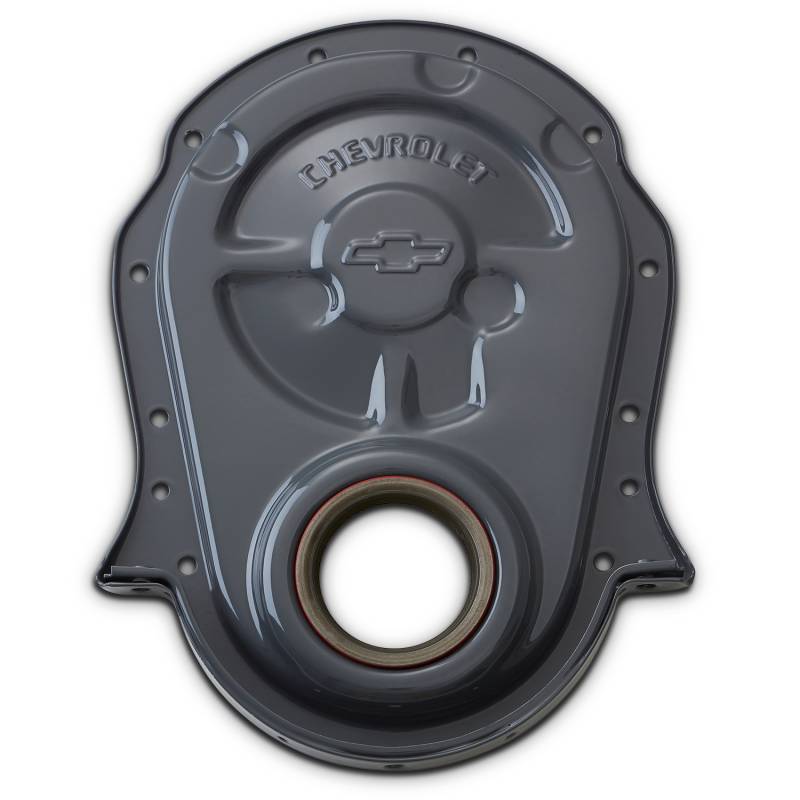 Engine Timing Chain Cover This Shark Gray timing chain cover has distinctive recessed Bowtie and CHEVROLET Emblems with inlaid red paint. For long-term corrosion resistance the cover is electrostatically painted and baked with a durable gray epoxy.