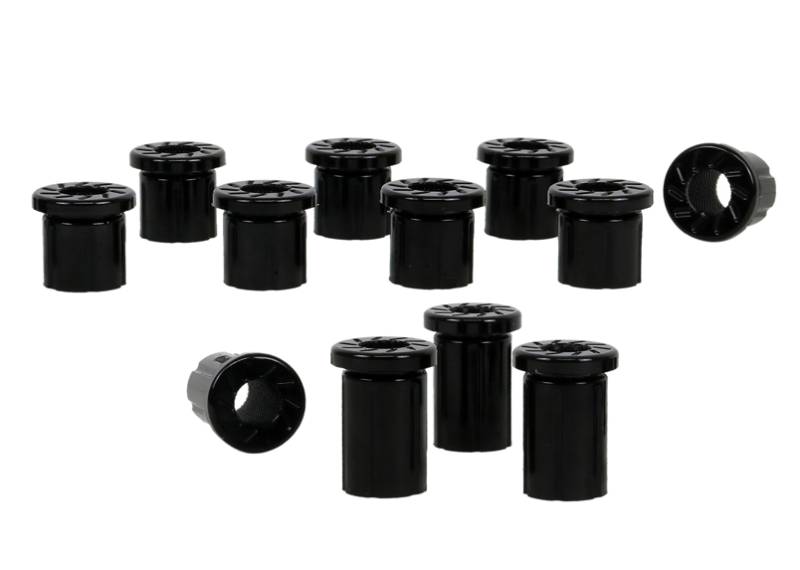 A critical service item for any leaf sprung vehicle. High kilometres and heavy load carrying causes excessive wear on rubber bushings. Whiteline's signature black bushings are made tough and offer outstanding abrasion resistance, high load bearing capability (4WD's, utes and towing), flexibility, increased tensile strength and chemical resistance to oil, grease, ozone and weathering.
