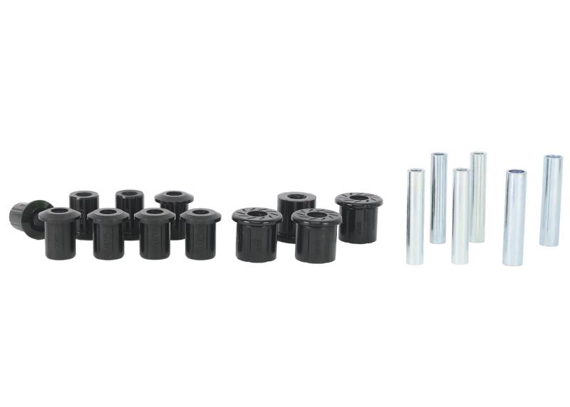 All in one leaf spring bushing service kit covering front and rear eyes of the leaf plus shackle bushings. High kilometres and heavy load carrying causes excessive wear on rubber bushings. Whiteline's signature black bushings are made tough and offer outstanding abrasion resistance, high load bearing capability (4WD's, utes and towing), flexibility, increased tensile strength and chemical resistance to oil, grease, ozone and weathering.