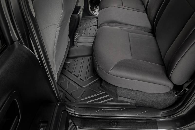 Introducing Flex-Fit floor mats ΓÇö the ultimate enhancement for your truck's interior and built tough to handle any challenge. Crafted from premium rubber-like material, these mats are as durable as they come, perfectly tailored to fit your truck's unique shape for a seamless finish.\ Stock floor mats just don't cut it for adventurers. They get trashed by mud, don't hold up to spills, and leave your carpets a mess. Give your ride the all-weather protection it deserves with Rough Country's Flex-Fit Floor Mats, the perfect solution for keeping your vehicle clean and protected.\ All-Weather Protection: Engineered to fit your vehicle perfectly, these mats provide top-notch defense against snow, mud, sand, saltwater, and more.\ Spill Saver Lip: Don't sweat the spills! Our mats feature a Spill Saver Lip that prevents liquids from reaching your carpet, so you can enjoy your coffee on the go without worry.\ Non-Slip, Textured Surface: Stay in control no matter the terrain with our mats' non-slip, textured surface, designed to keep your feet firmly planted while driving.\ Easy to Clean and Maintain: Cleaning up is a breeze! These mats are detachable and easy to clean, so you can spend less time on maintenance and more time hitting the road.\ Premium Materials: Constructed from a rubber-like TPE material, these mats are built to withstand extreme temperatures without cracking or warping. They will stay flexible and functional for the long haul.\ Effortless Installation: Forget wrestling with bulky mats. Flex-Fit Mats slide right into place for a quick and frustration-free installation.\ Upgrade your truck's defense against the elements with Rough Country's Flex-Fit Floor Mats. They'll keep your carpets looking fresh and give you peace of mind on every adventure.