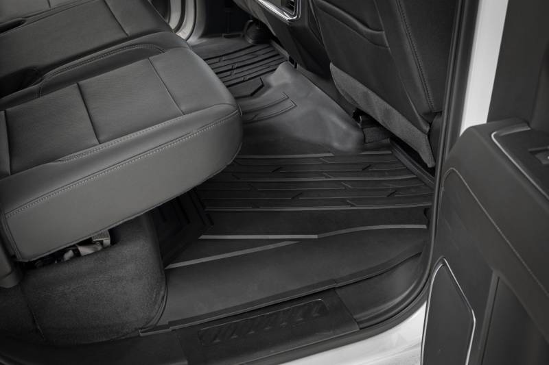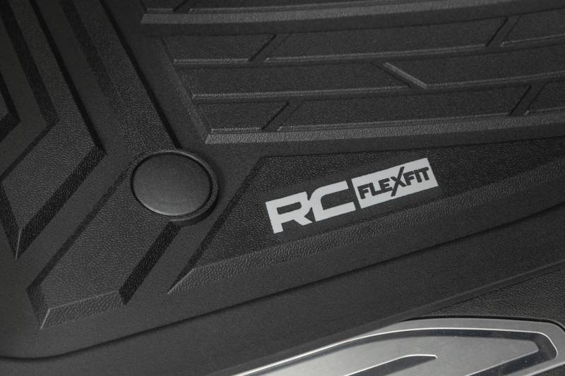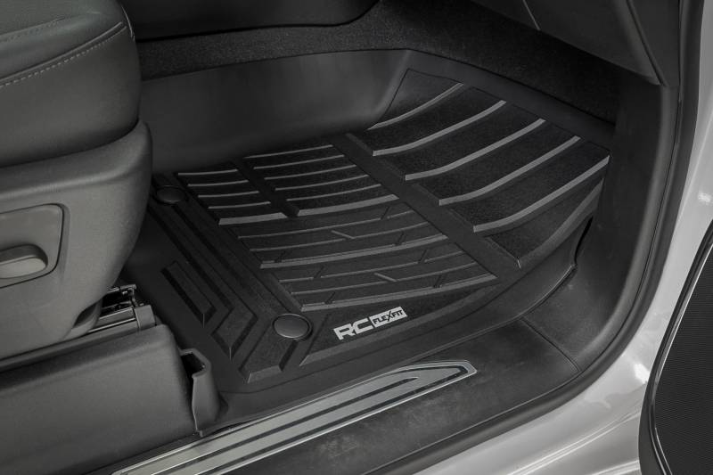 Introducing Flex-Fit floor mats ΓÇö the ultimate enhancement for your truck's interior and built tough to handle any challenge. Crafted from premium rubber-like material, these mats are as durable as they come, perfectly tailored to fit your truck's unique shape for a seamless finish.\ Stock floor mats just don't cut it for adventurers. They get trashed by mud, don't hold up to spills, and leave your carpets a mess. Give your ride the all-weather protection it deserves with Rough Country's Flex-Fit Floor Mats, the perfect solution for keeping your vehicle clean and protected.\ All-Weather Protection: Engineered to fit your vehicle perfectly, these mats provide top-notch defense against snow, mud, sand, saltwater, and more.\ Spill Saver Lip: Don't sweat the spills! Our mats feature a Spill Saver Lip that prevents liquids from reaching your carpet, so you can enjoy your coffee on the go without worry.\ Non-Slip, Textured Surface: Stay in control no matter the terrain with our mats' non-slip, textured surface, designed to keep your feet firmly planted while driving.\ Easy to Clean and Maintain: Cleaning up is a breeze! These mats are detachable and easy to clean, so you can spend less time on maintenance and more time hitting the road.\ Premium Materials: Constructed from a rubber-like TPE material, these mats are built to withstand extreme temperatures without cracking or warping. They will stay flexible and functional for the long haul.\ Effortless Installation: Forget wrestling with bulky mats. Flex-Fit Mats slide right into place for a quick and frustration-free installation.\ Upgrade your truck's defense against the elements with Rough Country's Flex-Fit Floor Mats. They'll keep your carpets looking fresh and give you peace of mind on every adventure.