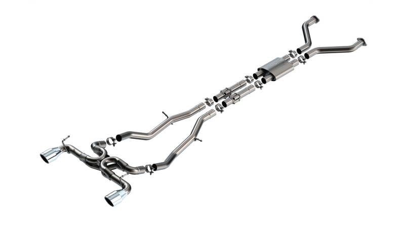 Cat-Back Exhaust System - ATAK® This system is a True Dual design that features a Resonator with an internal H-Pipe, Polyphonic harmonizer technology, and SwitchFire technology. All of these features combine to provide the aggressive ATAK sound. It provides a more exciting driving experience without any drone. The Merge X-Pipe blends the combustion pulses from both sides of the engine for improved performance and a custom sound. Borla 's Polyphonic Harmonizer Technology utilizes patented units that contain pipes of different diameters and lengths to create multiple exhaust notes that harmonize to deliver a clean, rich, full-bodied sound. Borla 's patented SwitchFire design further blends the combustion gases and sound waves. 4.5" polished phantom style T-304 stainless steel tips provide a custom appearance. Systems with carbon fiber tips with black anodized centers are also available. Borla Cat-Back exhaust systems feature patented technology to unleash hidden horsepower. Increased exhaust velocity adds power, driving excitement, fuel economy, and the distinctive Borla Sound of Power respected by motoring enthusiasts everywhere. Each system is built from premium, high-quality T-304 austenitic stainless steel, superior to T-400 series knockoffs (such as 409), to give you the absolute best in performance and durability. Ultra-smooth mandrel bends ensure maximum flow & power, and precision computer numerical control (CNC) manufacturing ensures an accurate fit. Best of all, Borla stands behind every system with a Million-Mile Warranty. Just what you'd expect from the world's most experienced (and most winning) exhaust brand. System Features: True Dual design featuring two full tail pipes Resonator contains an internal H-Pipe Features Polyphonic Harmonizer Technology Features SwitchFire Technology