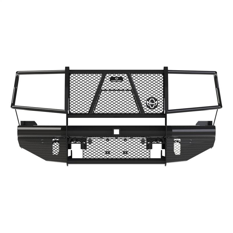 The Ranch Hand Legend front bumper is one of the toughest on the market. It is frame-mounted and has a one-piece, fully-welded construction that collectively reduces vibration, prevents rattling and ensures a secure fit. The main body of the bumper is manufactured from 4 in. schedule-40 pipe and diamond-plate steel, and the grille guard portion is composed of 12-gauge tubing, providing wraparound headlight protection. The punched plate grille insert is specifically designed to match the make and model of the truck with no expanded metal used. The Legend bumper comes standard with a 2 in. receiver, and most applications keep tow hooks and factory fog lights. It is constructed with a super polyester black powder coat finish to defend against corrosion for ultimate protection and durability. Originally designed for ranchers and farmers that needed more than a tough looking bumper -- but rather one that could assist in a full days work -- this is the iconic ranch-style bumper that started it all and paved the way for those behind it that only aspire to duplicate. This particular Legend bumper with grille guard fits select model years of the GMC Sierra 2500 HD and 3500 HD (see application info to verify fitment).