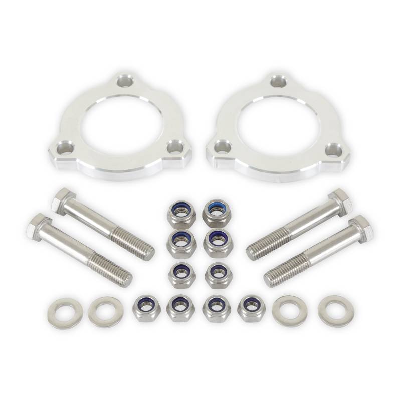 Most Broncos come from the factory with a rake. This means the rear of the vehicle is normally a little higher than the front, so that they sit level when fully loaded. These leveling kits improve the look of the Bronco by raising up the front to match the rear (when unloaded). Anvil's spacers are easy to install and maintain the factory ride quality. Includes all hardware and a detailed instruction sheet.