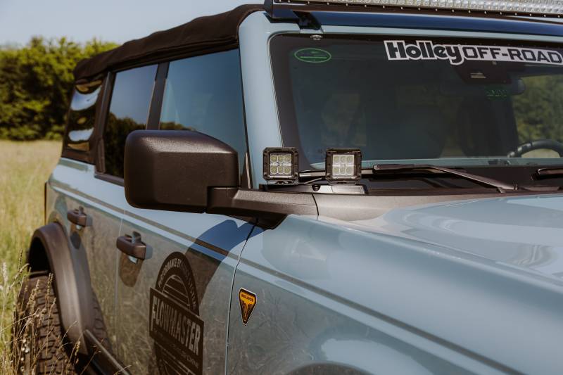 ANVIL Off-Road direct bolt-on mirror LED light mounts (A-pillar, ditch, or cowl lights). Perfect addition for your Bronco to add more light to see more out on the trails, desert, and any off-road adventure.