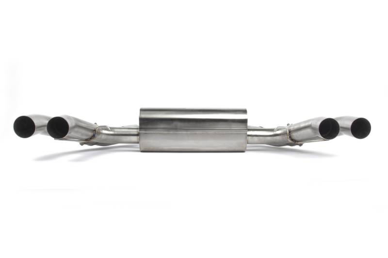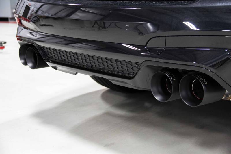 The "baby M's" of the 'X' family just got a bit more big brother like. With more volume and a deeper, more aggressive note courtesy of the Dinan axle back exhaust system, the F97/F98 now stand on the precipice of rivaling, or even surpassing, its V8 siblings --- at least, in regards to sound. With an intoxicating and menacing sound befitting of a high performance SUV the X3M/X4M holds its own amongst the pantheon of more traditional M's.\nIn order to achieve the deep and throaty signature Dinan sound the system incorporates larger 76mm tubing (vs 70mm stock) that allows freer flow through the entirety of the system but specifically to both outer pipes when the enlarged valves are open. The resulting flow and sound mimics an awe-inspiring straight pipe solution with a deeper, fuller tone, a defining element of all Dinan exhausts. In contradiction to the aggressiveness resulting from open valves, when the valves are closed, all gasses are forced into the muffler for sound deadening and exit the two inner tips. Regardless of valve position, the intimate nature of the interior is retained so conversation can continue without an excessively loud drone courtesy of drone abatement technologies housed within the can. With the Dinan exhaust equipped on the X3M/X4M you get the best of both worlds; aggressive tone/sound and civility\nPerhaps equally important to the sound of the installed Dinan axle back system are the resulting aesthetics. With a nearly perfect symmetrical design, the raw muffler and pipe routing are pleasing to the eye even when the matching proportions are only partially visible after install. The piping culminates into four massive 114mm (4.5") tips that fill up the previously spacious factory cut out in the valance without appearing to be oversized and unnatural. The imposing tips utilize a new tip design with an inverted clamp neck. The new style allows for two very important things to happen. The first is the ability to have a longer tip sleeve length without sacrificing real estate for a clamp neck thus allowing larger tips even when there is limited straight pipe to clamp on to. Secondly, the interior clamp neck means that the clamp itself is almost completely hidden from view for an unblemished install. Dinan has retained its signature straight cut tip design, safeguarding its unique and elegant styling position amongst a crowded marketplace full of angle cuts. With systems available with either black ceramic coated or polished clamp-on, and laser engraved exhaust tips, there is a version that is sure to meet your individual aesthetic needs.