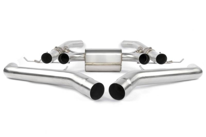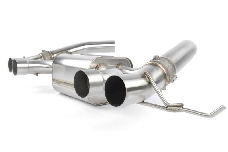 The G8x M3/M4 is arguably superior in every category to its predecessor but in most, if not all, circles the biggest downfall of the platform is in the sound department. Like the F8x before it with the S55, the S58 in the current generation leaves a lot to be desired. While a step in the right direction from its forerunner the stock vocals still carry far too much rasp that do not fully articulate the refined aggressiveness typical of the brands signature performance models. Dinan corrects this weakness with a valved axle back exhaust system that elevates the tone to a deeper, more meaningful note while also delivering an extra level of amplification above and beyond its stock counterpart. Coupled with the optional middle exhaust / x-pipe for the platform an even louder, smoother, and fuller soundtrack is possible.\nThrough extensive development and testing nearly every possible permutation of the exhaust was attempted. Unlike the previous generation where cabin sound/drone was largely unchanged between the sedan and the coupe, that was not the case with the G8x chassis'. This caused countless iterations to be attempted in the quest for a common system that not only sounded superb externally but one that also didn't introduce an overbearing internal cabin drone on either body type. The result is a system we are confident will be coveted by all for years to come. To achieve desired sound volume and tone worthy of the G8x M3/M4 the tubing was enlarged to 76mm (vs 70mm stock) to allow freer flow, and reduce backpressure, throughout the entirety of the system. The larger piping gives way to multiple pathways as it nears the rear of the vehicle -- the choice of which is utilized determined by the factory exhaust valves which are retained. When valves are closed, flow is directed into the Dinan muffler, where absorption and reactive technologies are used, and exit out the two inner tips. This limits noise during low-speed driving and produces a more subdued, albeit deeper, and agreeable note. However, when the valves are open during high-load conditions the bulk of the gases bypass the muffler altogether for a near straight pipe design and maximum aural enjoyment to be achieved. It's the perfect marriage for all tastes and allows civility or impassioned aggression depending on what the situation demands. The combination is one Dinan has deemed fitting for the marques signature performance models that cater to the tasteful enthusiast who demand the best for all situations.\nVisually, the Dinan G8x M3/M4 exhaust has been skillfully crafted entirely out of T304 stainless steel and TIG welded for the best visual appearance and color. The entire system is then brush finished to further guarantee an immaculate looking system out of the box. The attention to detail is not limited to parts of the system you can't see once the exhaust is installed but is also extended to the exhaust tips themselves. The Dinan exhaust includes massive, quad 4.5-inch (114mm) clamp-on, double-walled, polished stainless steel and laser engraved exhaust tips. Despite the seemingly cartoonish size on paper, the tips mesh seamlessly and fill the factory cut-outs to complete the OEM+ look with a healthy dose of audible attitude.