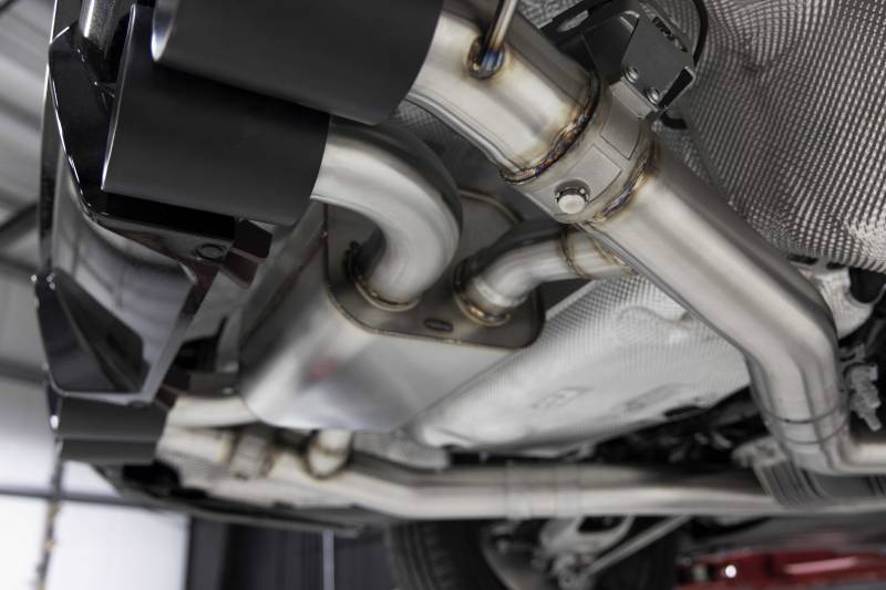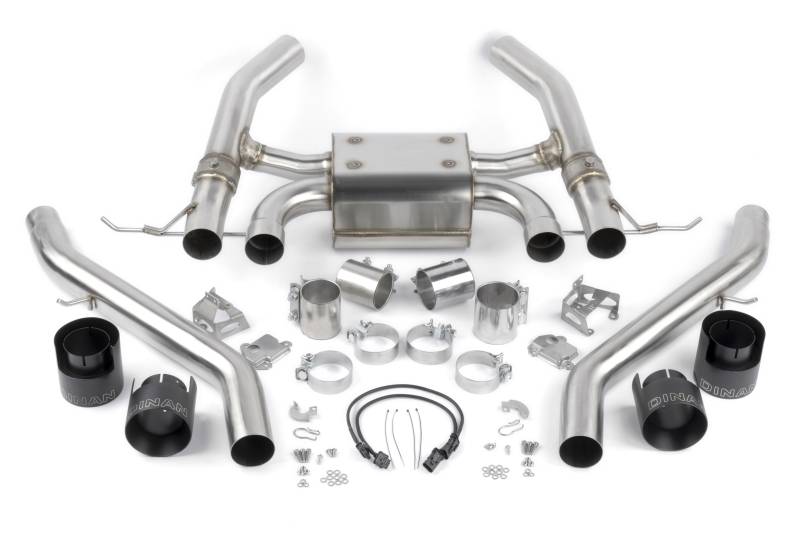 The G8x M3/M4 is arguably superior in every category to its predecessor but in most, if not all, circles the biggest downfall of the platform is in the sound department. Like the F8x before it with the S55, the S58 in the current generation leaves a lot to be desired. While a step in the right direction from its forerunner the stock vocals still carry far too much rasp that do not fully articulate the refined aggressiveness typical of the brands signature performance models. Dinan corrects this weakness with a valved axle back exhaust system that elevates the tone to a deeper, more meaningful note while also delivering an extra level of amplification above and beyond its stock counterpart. Coupled with the optional middle exhaust / x-pipe for the platform an even louder, smoother, and fuller soundtrack is possible.\nThrough extensive development and testing nearly every possible permutation of the exhaust was attempted. Unlike the previous generation where cabin sound/drone was largely unchanged between the sedan and the coupe, that was not the case with the G8x chassis'. This caused countless iterations to be attempted in the quest for a common system that not only sounded superb externally but one that also didn't introduce an overbearing internal cabin drone on either body type. The result is a system we are confident will be coveted by all for years to come. To achieve desired sound volume and tone worthy of the G8x M3/M4 the tubing was enlarged to 76mm (vs 70mm stock) to allow freer flow, and reduce backpressure, throughout the entirety of the system. The larger piping gives way to multiple pathways as it nears the rear of the vehicle -- the choice of which is utilized determined by the factory exhaust valves which are retained. When valves are closed, flow is directed into the Dinan muffler, where absorption and reactive technologies are used, and exit out the two inner tips. This limits noise during low-speed driving and produces a more subdued, albeit deeper, and agreeable note. However, when the valves are open during high-load conditions the bulk of the gases bypass the muffler altogether for a near straight pipe design and maximum aural enjoyment to be achieved. It's the perfect marriage for all tastes and allows civility or impassioned aggression depending on what the situation demands. The combination is one Dinan has deemed fitting for the marques signature performance models that cater to the tasteful enthusiast who demand the best for all situations.\nVisually, the Dinan G8x M3/M4 exhaust has been skillfully crafted entirely out of T304 stainless steel and TIG welded for the best visual appearance and color. The entire system is then brush finished to further guarantee an immaculate looking system out of the box. The attention to detail is not limited to parts of the system you can't see once the exhaust is installed but is also extended to the exhaust tips themselves. The Dinan exhaust includes massive, quad 4.5-inch (114mm) clamp-on, double-walled, black ceramic coated clamp-on tips and laser engraved exhaust tips. Despite the seemingly cartoonish size on paper, the tips mesh seamlessly and fill the factory cut-outs to complete the OEM+ look with a healthy dose of audible attitude.