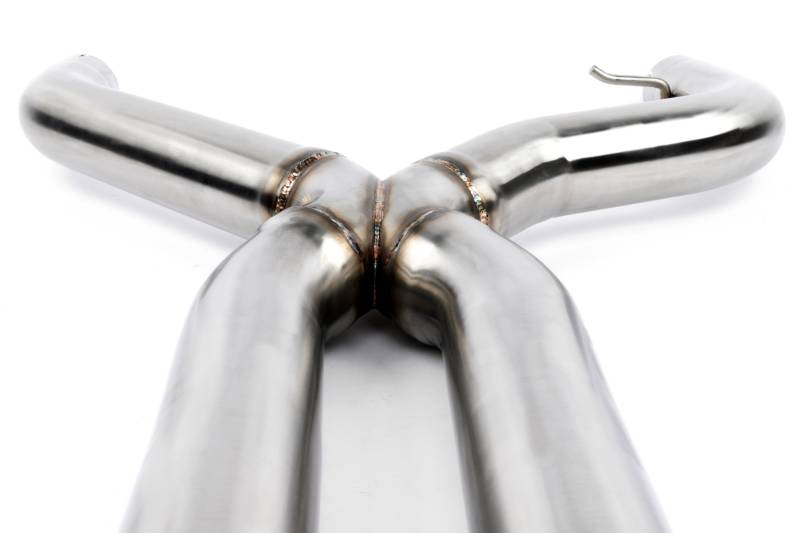 Looking to elevate the external acoustics of your G8x but want to upgrade in stages and/or not break the bank?\nThe Dinan Middle Exhaust for the G80 M3 is and G82/G83 M4 introduces a more aggressive tone and an increase in volume over the stock system while retaining the factory muffler at a budget friendly price point. Should the desire for more arise however, it can easily be paired with the matching Dinan axle back exhaust for further aural enhancement and a more aggressive growl. It is a union that boasts a bold, yet sophisticated, exhaust note that neither can fully achieve on their own.\nThis middle exhaust itself removes the hydro-formed factory center section from the secondary catalysts back to the axle back, including both resonators, and replaces it with larger 3-inch T304 stainless steel tubing for freer flowing capabilities. In place of the forward factory resonator, Dinan incorporates a beautifully crafted X-pipe made from mandrel-bent tubing for minimum restriction, unlike stamped X-pipes which are commonplace in the market. This hand-made 'X' is not only the focal point of the system in terms of aesthetics but also the star when it comes to the effects on the sound. Promoting even flow to both banks of tips, the 'X' removes unwanted nuances in sound caused by uneven exhaust flow that is present in the stock system. Along with the inherent benefit of increased volume by removal of the resonators, the Dinan X-Pipe for the G8x M3/M4 produces a louder, smoother, and fuller exhaust note that will deliver smiles time and time again.