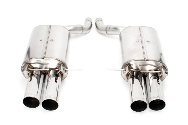 The Dinan M5 Axle-Back exhaust system provides maximum flow characteristics for optimum power gains while producing a civilized yet very sporty exhaust note that is appropriately aggressive at wide-open throttle. And there's none of that irritating low RPM ''drone'' that is common with so many aftermarket mufflers. The mufflers are manufactured from 100% 304 stainless steel inside and out for maximum resistance to corrosion and nearly a 30% reduction in weight eliminating over 20 lbs.\nThe four 3.5'' diameter polished, or ceramic black, stainless steel tips not only give the car a more aggressive look but also feature Dinan's new ''Cool Tip'' design that effectively reduces temperatures in order to minimize radiant heat that can affect bodywork over time, as well as avoid discoloration of the tips themselves. The Cool Tips also avoid the possibility of a nasty burn while loading items in the trunk. Employing the principle of rarefaction, the design features an inner and outer tip with a vent at the base. When a positive pressure wave travels to the end of an open pipe and is ultimately expelled into the atmosphere, a rarefaction or momentary drop in the density of the surrounding air is created behind it. This momentary drop in the density of the air surrounding the pipe's exit creates a vacuum, pulling the air from the surrounding area to fill the void. The vent at the base of each outer tip then enables air to be drawn in effectively cooling the tips.\nUtilizing the factory brackets and hangers the Dinan exhaust mounts in a factory-like fashion for a perfect fit and clean installation.