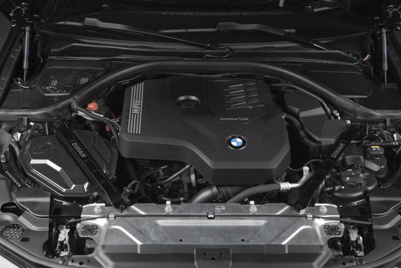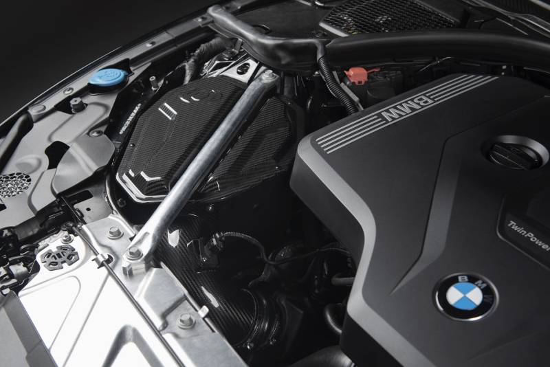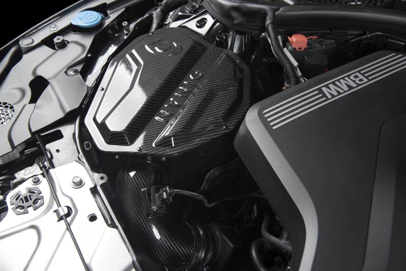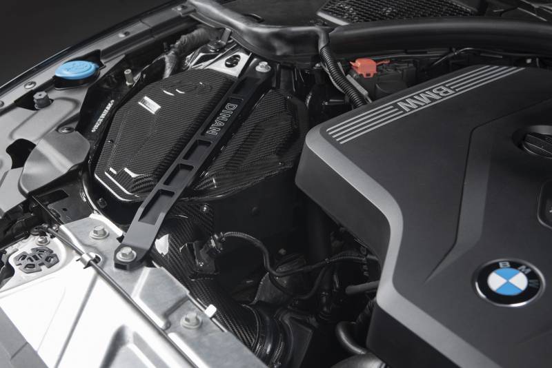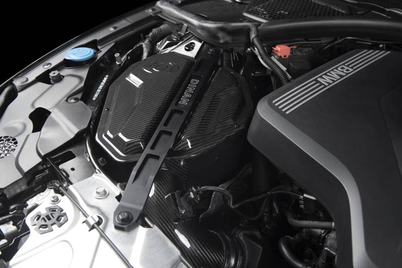In the quest to be all things to all people at an attractive price point the 230i/330i/430i has been reduced to a mundane, albeit pragmatic, core with elements devoid of any character both outwardly and inwardly. For example, in stock trim, the 230i/330i/430i comes with a utilitarian and lifeless air box swaddled by seemingly unfinished braces and housing a basic panel filter that is also accompanied by an intake resonator whose job it is to eliminate turbo/intake noises. The same noises that those in the performance world relish. Essentially, BMW has seen fit to give 230i/330i/430i owners an air box that looks uninspiring, flows adequately but not ideally, and emits no noise. The Dinan carbon fiber intake for the platform rights these wrongs and delivers a semi-open intake capable of flowing 58% more air than the stock system resulting in improved throttle response and the elimination of a potential roadblock when opting to pursue a high-powered build (upgraded turbo, fueling, etc). At the same time the Dinan kit unveils a more aggressive, sporty carbon fiber appearance, and an increase in sound courtesy of the removal of the intake resonator and implementation of the semi-open design.\nIn order to accomplish the feat in flow that sets the Dinan intake system apart the entire lower box of the system, and not just the lid, has been reworked and enlarged in an effort to make use of as much of the available real estate as possible within the engine bay. In turn, this allows a 40% larger, custom, free flowing filter to be housed within and maximum flow to be realized. However, a secondary inlet has always been desired by Dinan in order to effectively fill the volume of the enlarged air box and increased filter surface area. This desire led to a multitude of experiments being conducted on the effectiveness of a possible open-air inlet in the system. With different shapes, locations, and sizes of openings being tested, the goal was to ensure that the added secondary inlet did not cause any unwarranted side effects such as an increase in air temps in the system. This is commonplace with open-air intake systems where overheated engine bay air is employed in the intake tract. The results of these tests showed that the patterned openings present in the final iteration of the box on the opposite side from the engine provided a perfect balance of additional volume to assist the factory snorkel all the while not causing an increase in turbo inlet temperatures. This was the case regardless of testing conditions (single/multiple gear pulls, constant speed, 0-100mph runs, etc.).\nWhile the additional flow does not translate to any noteworthy rise in power output for stock or basic bolt-on equipped vehicles, the Dinan intake system does expand the potential of the platforms power ceiling. Put simply, those striving to build a more potent and robust solution, complete with turbo and fueling upgrades, will be allowed to maximize the results without worry of the intake system being a limiting factor. Regardless of the level of build, the secondary air inlets allow the intake system to be more audible so the turbo spool and BOV can be appreciated. A stark difference from Dinan's traditional fully sealed systems where induction noise is not nearly as recognizable. Not to be outdone by the increased flow and sound, the outwardly visible system is made of immaculate carbon fiber so the under the hood appeal is vastly improved over its drab and utilitarian beginnings. In and of itself, making it worth the price of admission.