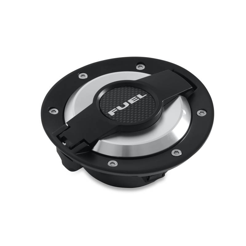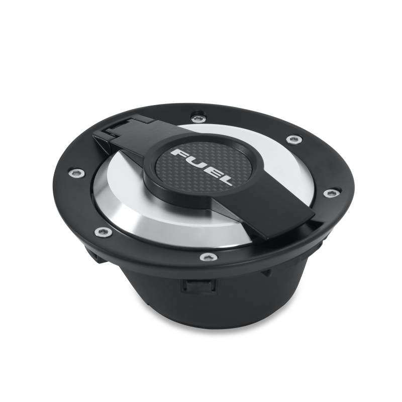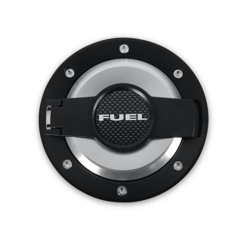 This fuel door is made of high-quality billet aluminum and anodized black. Diecast with stainless faux fasteners and featuring a plunger for positive opening and closing, these doors also have a printed carbon fiber emblem embossed with the word "fuel" to give them their finishing touch. Includes plastic inner housing and fuel fill system.