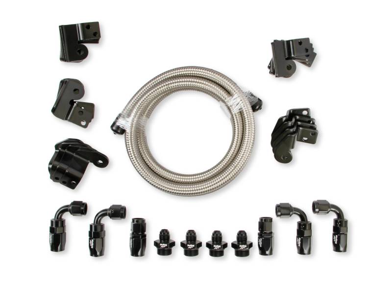 Our fuel rail kit allows dual -8AN feeds to keep up with fueling demands with fuels like E85, E98, M1, and the like.\nThis kit will also allow you to run both rails to a single high-flow fuel pressure regulator for complete control over your fuel system.\nIncludes (2) fuel rails (4) -6 to 3/4"-16 O-ring fittings, (6') braided hose, (4) 90º and (2) straight -6 hose ends, fuel rail mounting brackets, and required mounting hardware.
