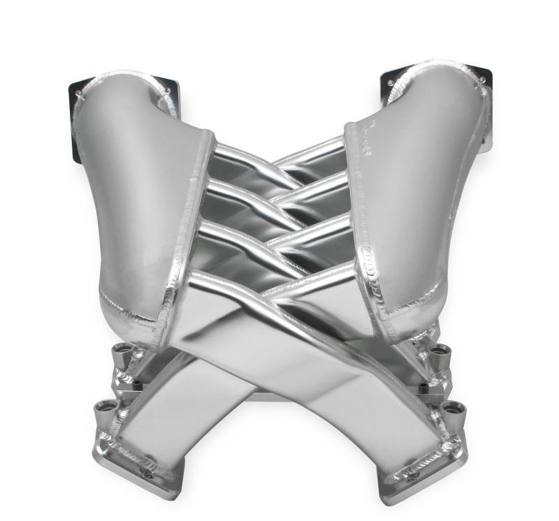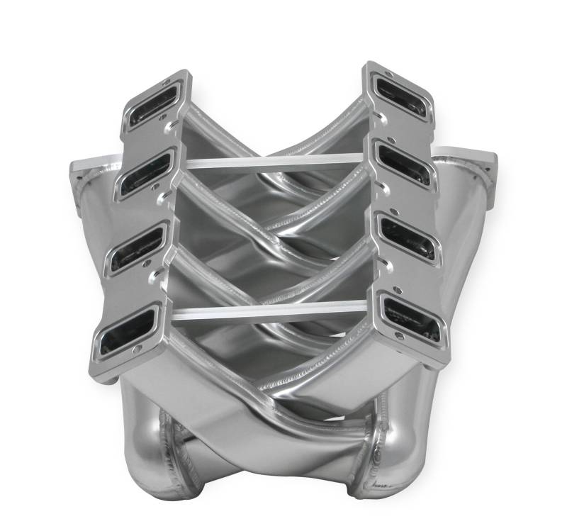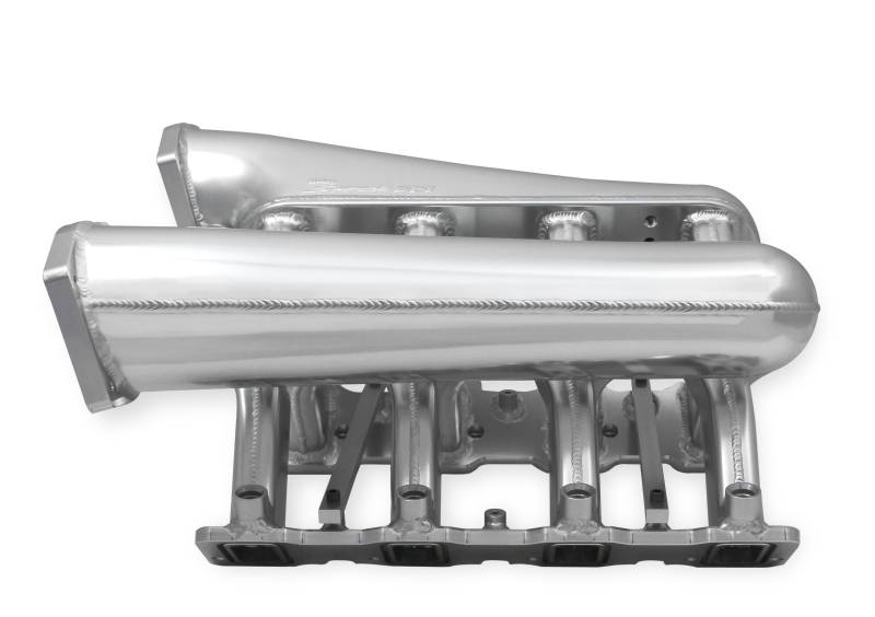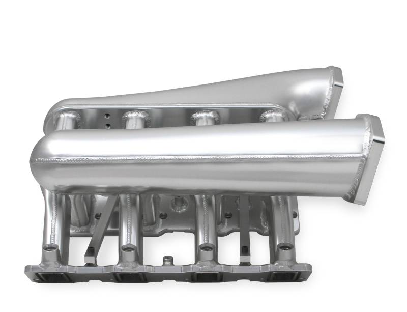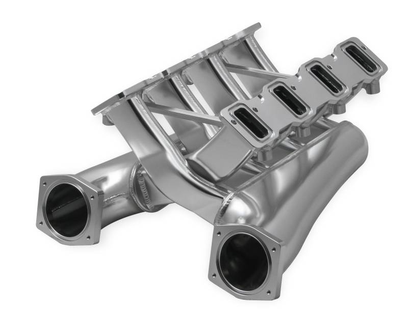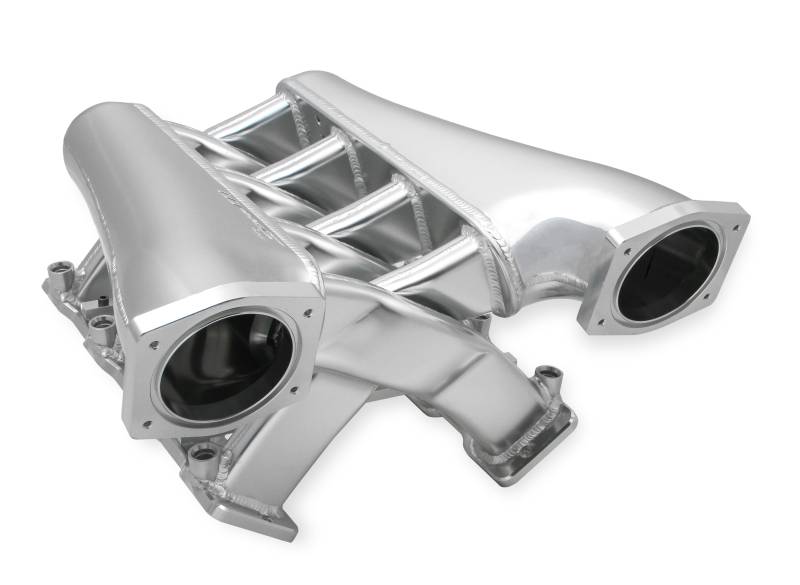 Holley continues to push the envelope of intake design with its latest offering. The unique look of this intake will surely stand out from the crowd!\nOur latest release of fabricated "Dual Plenum" intake manifolds for GM LS1/2/6 and LS3/L92 engines. This unique design of utilizing two plenums solves two common problems experienced with many intakes increased airflow and even dispersion of air to intake ports.\nThe use of one tapered plenum to accommodate one bank of cylinders accomplishes both problems. The entire volume of incoming air is distributed to only four cylinders and the tapered shape of the plenum help increased air velocity directed to each of the intake runner ports.\nOur dual plenum design features extremely long 12-3/4" runners to develop low-end torque making this intake an ideal "street" intake.\nThese intake are finished in our familiar silver and black anodized finishes for durability and good looks. Our 3/8" fuel rail kit include a laser engrave Sniper logo and are capable of supporting 750+ horsepower.