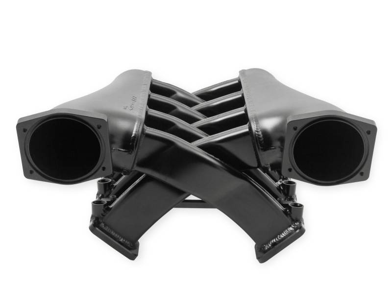 Holley continues to push the envelope of intake design with its latest offering. The unique look of this intake will surely stand out from the crowd!\nOur latest release of fabricated "Dual Plenum" intake manifolds for GM LS1/2/6 and LS3/L92 engines. This unique design of utilizing two plenums solves two common problems experienced with many intakes increased airflow and even dispersion of air to intake ports.\nThe use of one tapered plenum to accommodate one bank of cylinders accomplishes both problems. The entire volume of incoming air is distributed to only four cylinders and the tapered shape of the plenum help increased air velocity directed to each of the intake runner ports.\nOur dual plenum design features extremely long 12-3/4" runners to develop low-end torque making this intake an ideal "street" intake.\nThese intake are finished in our familiar silver and black anodized finishes for durability and good looks. Our 3/8" fuel rail kit include a laser engrave Sniper logo and are capable of supporting 750+ horsepower.