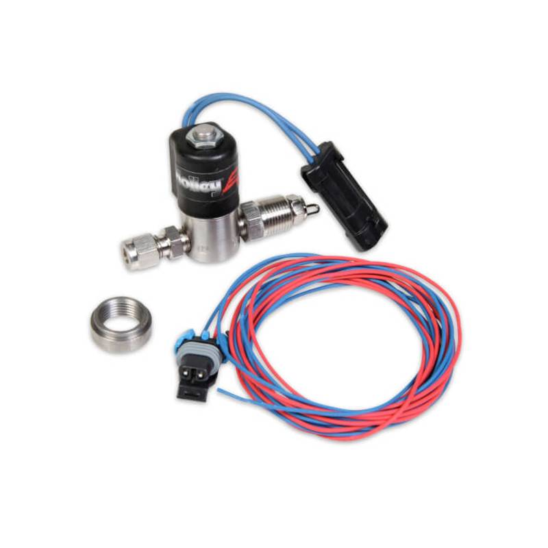 Take your forced induction ride to the next level with a Holley water/meth injection system! Integrated into the Holley HP and Dominator EFI Systems is the capability to control water/methanol injection, allowing you to safely run on lower octane pump gas!\nWhat makes the Holley water/methanol system unique and light years ahead of competitive systems, is that the solenoid flow has been characterized within the ECU. Program in an exact flow amount into the software, and that flow is injected into the engine. This is critical to ensure that neither too little (causing engine damage), nor too much (causing a large loss in power) water/methanol mix is injected into the engine. Select the exact percentage of water/methanol mix to be delivered vs. the percentage of fuel flow present, at any RPM and load. This makes tuning a very simple and accurate process.\nAll components are designed to be compatible with water/methanol mix of up to 50% methanol. The Water/Meth solenoids are run by an injector driver output. If an extra output is not available (as would be the case on a HP ECU driving 8 injectors), PN 554-115 can be purchased that can be driven by a low side PWM output.