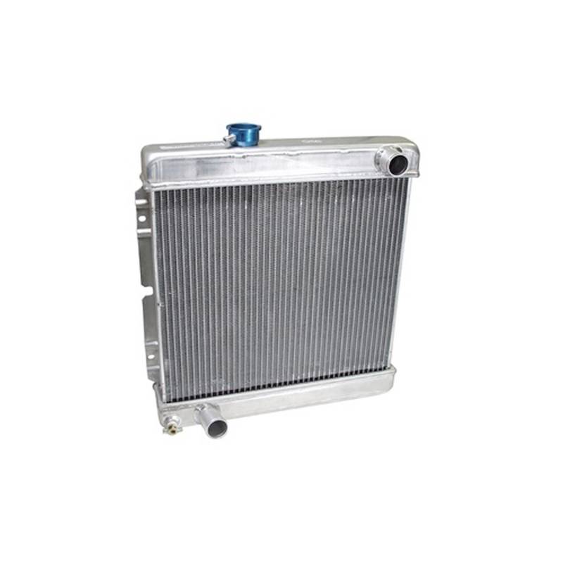 The Scott Drake high performance 2-core aluminum radiator is the ultimate cooling solution for 1964.5-66 Mustangs running a late model 5.0L V8. These heavy-duty radiators feature extra large 1" tubes for 4 row efficiency without the added weight. The also are equipped with the Scott Drake exclusive baffle on the top tank to help evenly distribute the flow of hot water through the radiator. Original radiators had a serious problem distributing the hot water to the far right side of the radiator. This baffle design has been extensively tested and recorded significant changes in the temperatures across the radiator's cooling tubes. This radiator is equipped with integrated automatic transmission cooling lines and a brass petcock drain. For use with auto or manual trans cars.