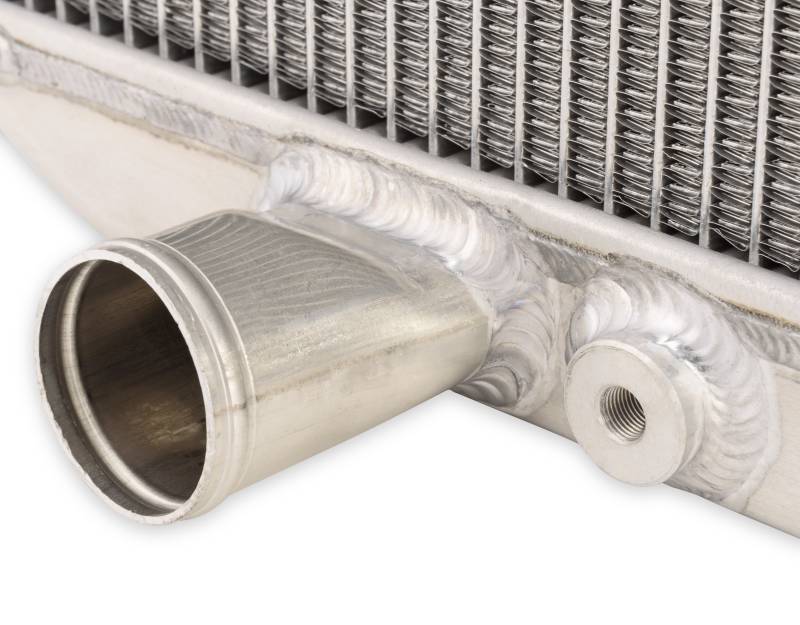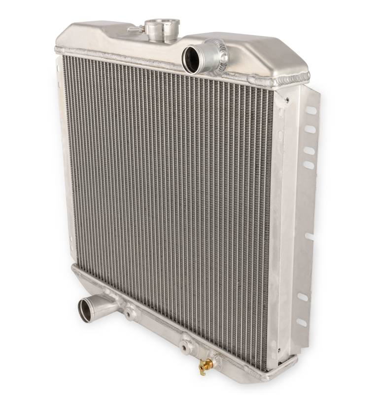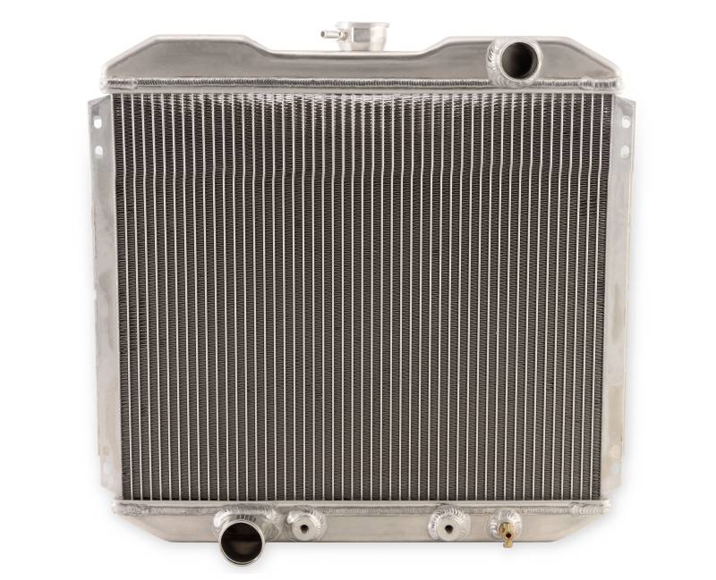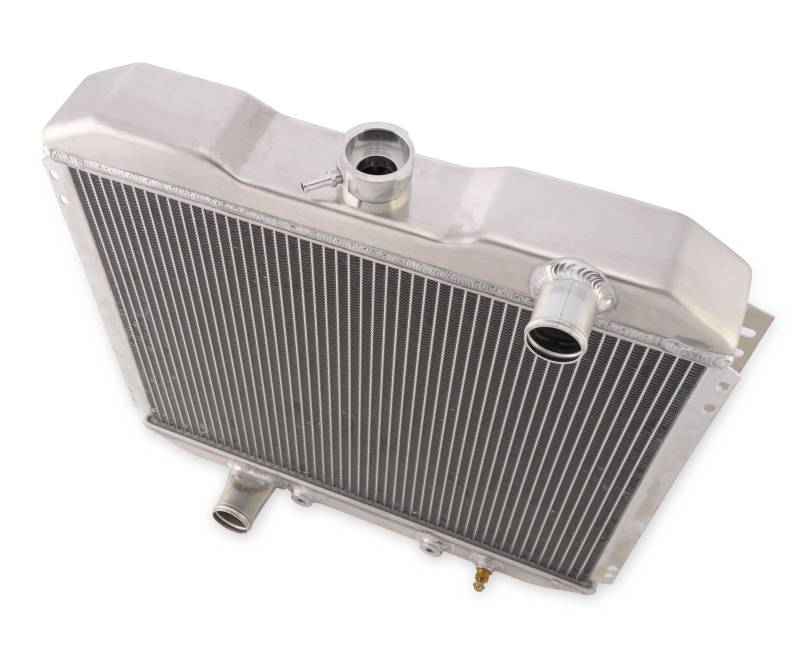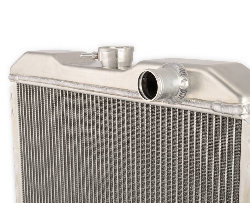 This brand-new, 2-row 20-inch radiator is made from high-quality aluminum. It features 2 rows of extra-large, 1-inch tubes for 4-row efficiency minus the added weight, weighing in at 5-7 fewer pounds. The original, stock radiators for 1967-1969 Mustangs had trouble distributing the hot water to the far-right side of the radiator. This radiator, however, is equipped with Scott Drake's specially designed, extensively tested baffle, which works to dispense the flow of hot water throughout the radiator evenly. This radiator includes a transmission cooler. Its inlet diameter measures 1-1/2 inches and its outlet diameter measures 1-3/4 inches.