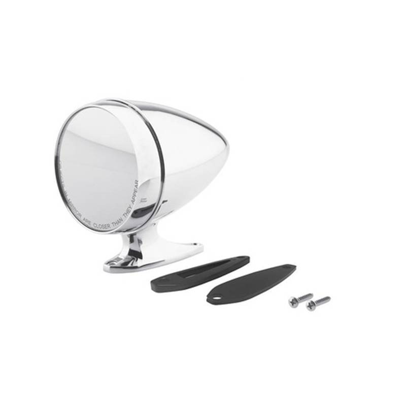 Add cool custom styling to any classic Mustang or Ford with Scott Drake bullet-style mirrors. These chrome mirrors are modeled after the original Rotunda mirrors used on 1966 Shelby GT350s. They were also offered as a dealer-installed option by Ford. Each mirror features precision die-cast construction using all-new Scott Drake tooling. The perfectly formed mirror housing contains a precise spring tension system and nylon glide bushing to deliver easy and reliable positioning. Finished in a bright show-quality chrome finish for years of lasting good looks. The high-quality glass provides clear optics, convex for use on the passenger side. Each mirror includes stainless steel mounting hardware, a contoured mounting pad for installation a 64-68 Mustang door, and a flat mounting pad for custom applications.