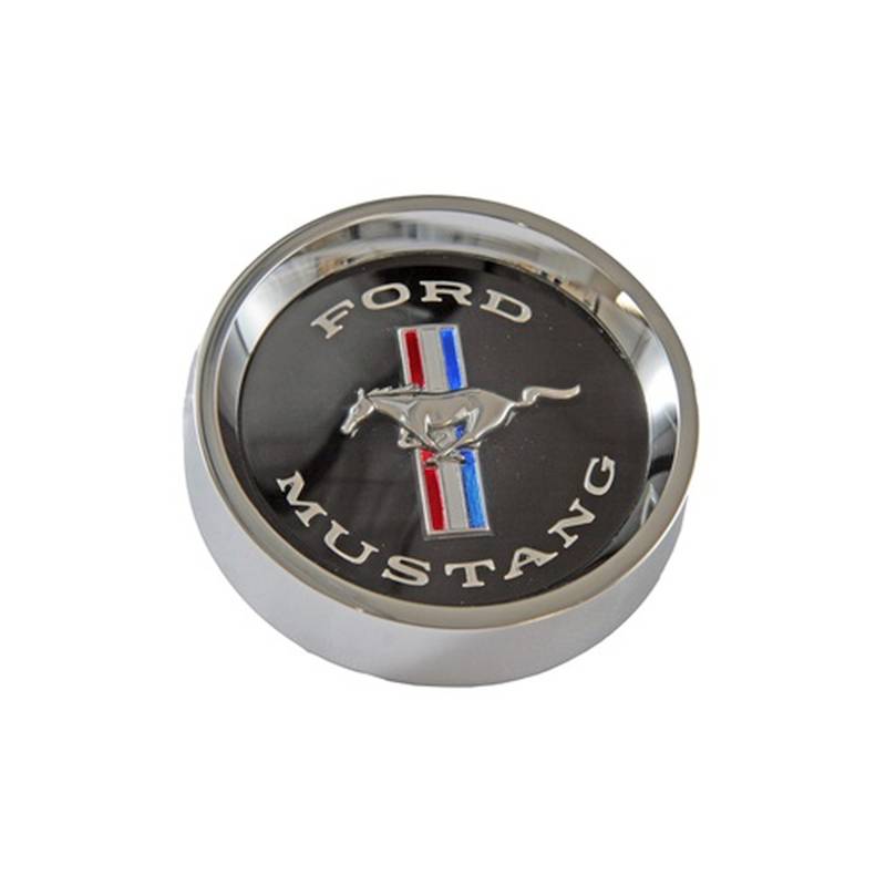 This styled steel wheel center cap is an OE-style reproduction that was originally used on 1965-1966 Mustangs that had styled steel wheels. This cap has a die-cast chrome construction along with an improved mounting design that will ensure it will perform under high RPMs. The layout of the cap features Ford Mustang text wrapped around the iconic tri-bar running horse logo. Officially licensed by Ford Motor Company. Sold individually.