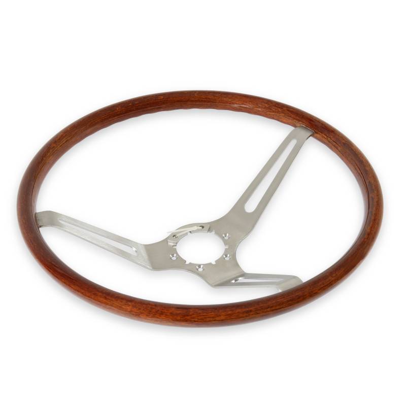 The Corso Feroce LT-15 steering wheel was inspired by the original 16" simulated wood steering wheels commonly used as a deluxe option on many GM cars of the '60s and early 1970s. The LT-15 features a 15" diameter genuine hardwood rim with a rich authentic color and sculpted finger indents. The classic three-spoke design is crafted from show-quality CNC machined aluminum with brushed stainless steel spokes and has a 4" dish just like the originals. This wheel is a direct replacement designed to work with the vehicle's original mounting hub and horn button. The Corso Feroce LT-15 is the ideal steering wheel for your 60's and 70's GM vehicles.