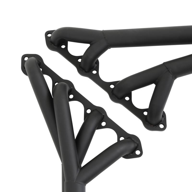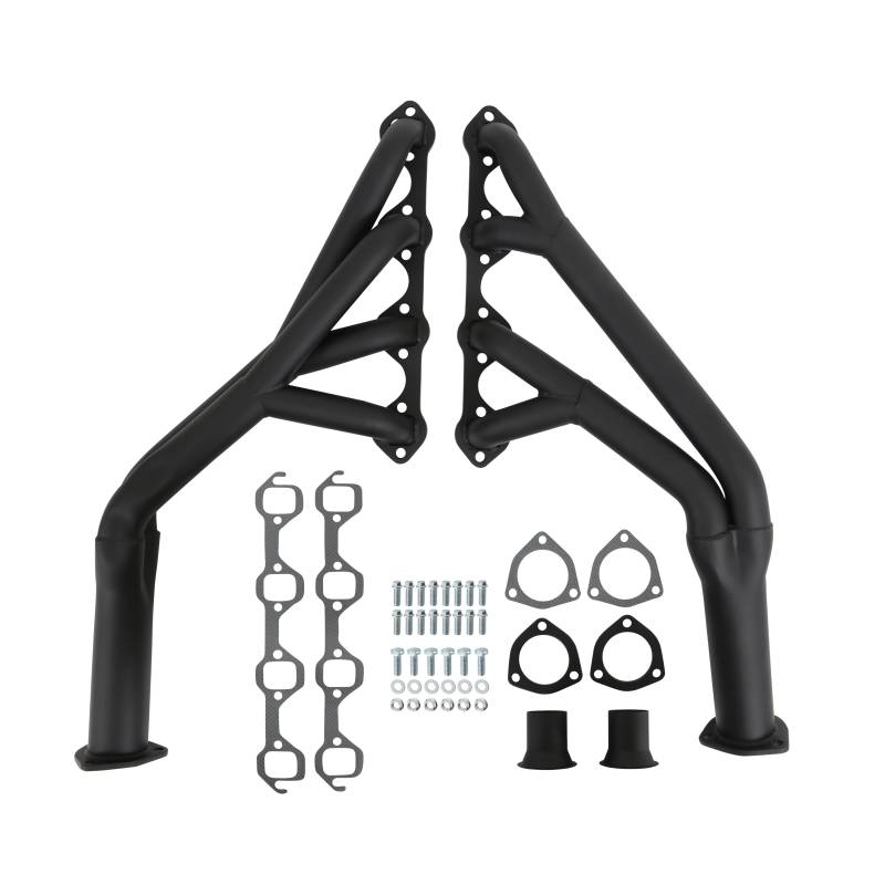 Mild steel, 16-gauge tubes are CNC mandrel bent, then carefully welded on our precision engineered welding jig for a perfect fit. These fit both automatic and manual transmissions with the more common 157 Tooth small bell housing, along with extra clearance for starter, mounting flange bolts can easily be accessed and they clear shock towers. Provides full articulation of steering assembly without interference. Power steering cars require a drop-down bracket. Cars with the larger Bellhousing for 164 Tooth Flywheel will need to dimple the header and possibly remove a minimal amount of material from the bell housing for proper clearance. Shortened collector tubes improve floor pan clearance. All Headers include extra-thick, precision ground 5/16" inch flanges to prevent warping, metal composite flange gaskets, 1" inch primary tubes, 1" inch secondary tubes, and 2 1/2" to 2" inch collector/reducers. Gaskets and all necessary mounting hardware are included.